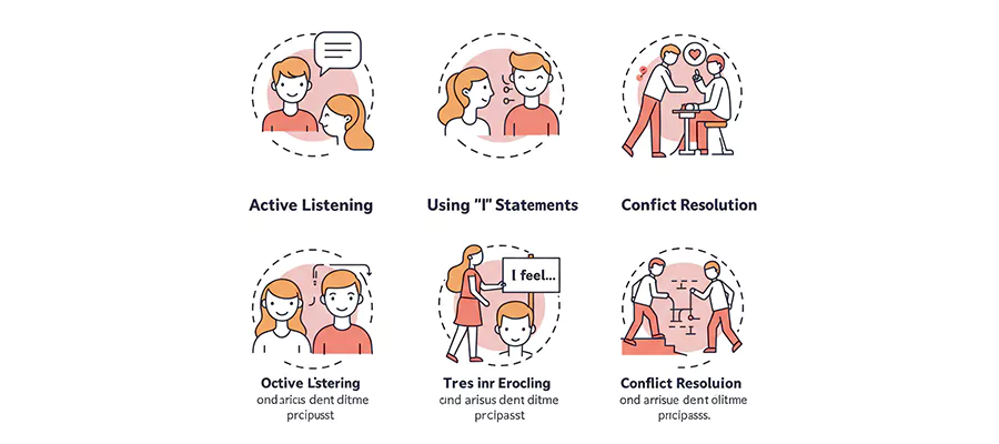 “شنیدن فعال” به معنای تمرکز کامل بر صحبتهای طرف مقابل و بازخورد دادن برای تأیید درک مطلب است. “جملات من” (مانند: “من احساس میکنم…”) به جای جملات سرزنشآمیز (“تو همیشه…”) به افراد کمک میکند تا مسئولیت احساسات خود را بپذیرند و به گونهای صحبت کنند که طرف مقابل حالت تدافعی نگیرد.